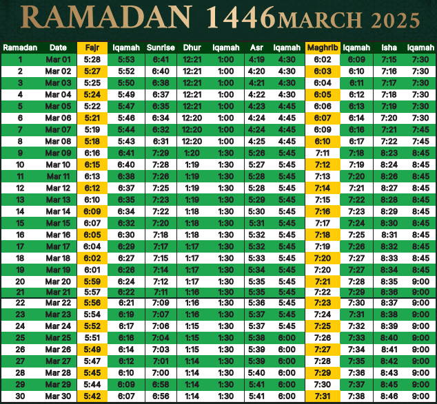 SLMS All – Eid is on Eid prayer times are 7.30am imam Sohail 9am imam omar and 10.30 imam wali Please plan to arrive early as parking is tight ALSO If u are able to .. Please donate at least $20 per family towards masjid operations when u attend eid prayers This is one of the days where the Masjid has its highest attendance Each person/ family doing this will IA help in a big way towards the masjid meeting its annual operations costs Jz Assalamu Alaikum, Dearest Community: ASA WRB – We welcome each one of you as we strive to make this Masjid campus better and a place of comfort and growth to each of you to want to return to. Please forgive our shortcomings. Please join in and improve with us this campus so that we all can better serve any one who comes to us whatever thier circumstances with us with our time, wealth and intellect. WAS Muhammad Farooq, Current Pres.; Mian Saeed, Past Pres (retired).; Abida Saeed, Founding Membe (deceased). Please take of THESE VERSES:…. before that Day comes when it is too late for you to help yourself) it is righteousness… to believe (Al-Baqara, Chapter #2, Verse…
